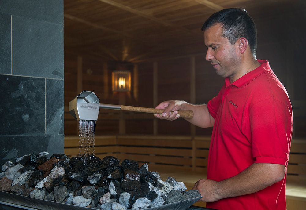 - Der Saunameister bleibt noch 2 – 3 min. vor der Sauna. Bei heißen Aufgüssen kann es passieren, dass ein Gast Kreislaufprobleme bekommt und beim Verlassen der Sauna Hilfe benötigt. Außerdem kann der Saunameister die Gelegenheit nutzen, sich ein Feedback zu dem Aufguss einzuholen bzw. für Fragen der Gäste zur Verfügung zu stehen.
